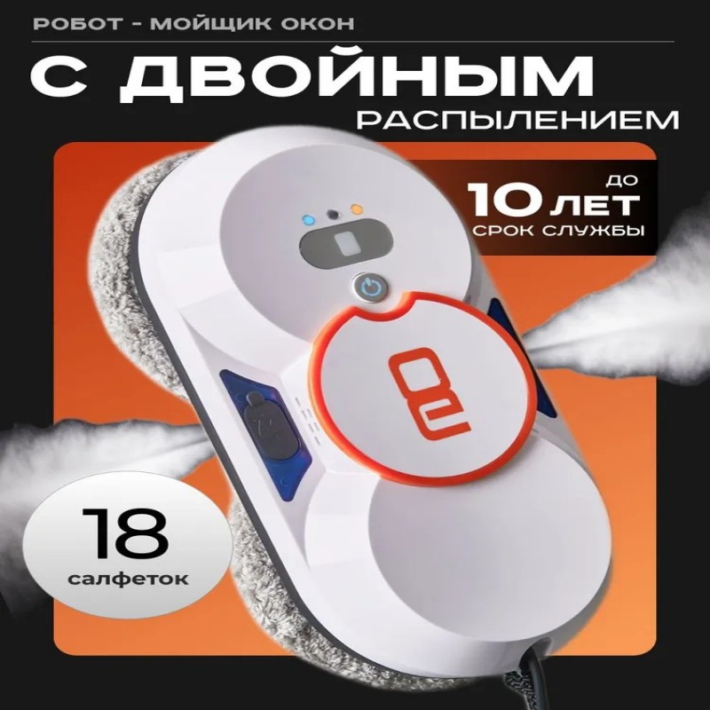 КомплектацияРобот мойщик окон с распылением -1 шт.; Сменные салфетки - 18 шт.; Страховочный шнур 4 метра - 1 шт.; Пульт - 1 шт.; Адаптер питания с кабелем (4 м) - 1 шт.; Кабель питания 1,2 м - 1 шт.; Запасные кольца для салфеток - 2 шт.; Емкость для жидкости - 1 шт.; Инструкция - 1 шт.