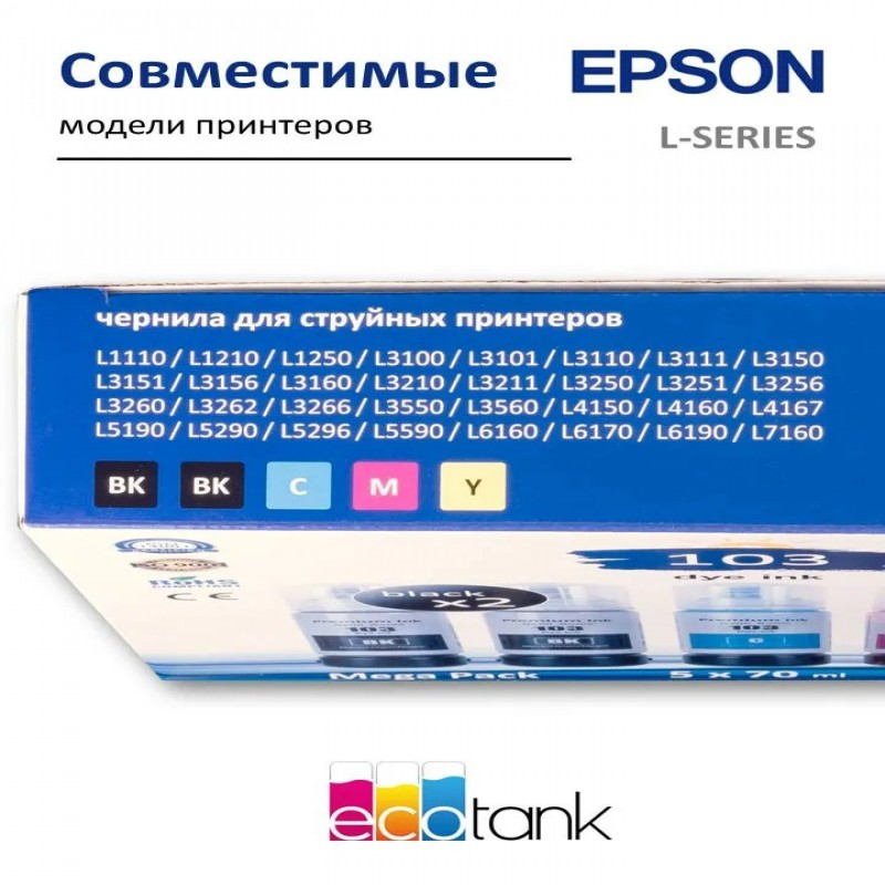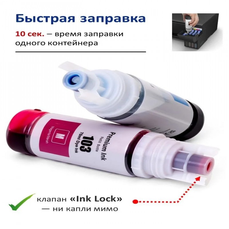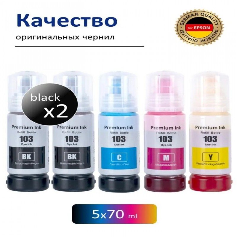 Комплект чернил 103/101 для заправки струйных принтеров EPSON L-series (краска эпсон 103). Чернила подходят для заправки фирменных и совместимых картриджей, системы непрерывной подачи чернил (СНПЧ), перезаправляемых картриджей (ПЗК). В наборе 5 флаконов по 70 мл., черный (2 шт), голубой, пурпурный, желтый.