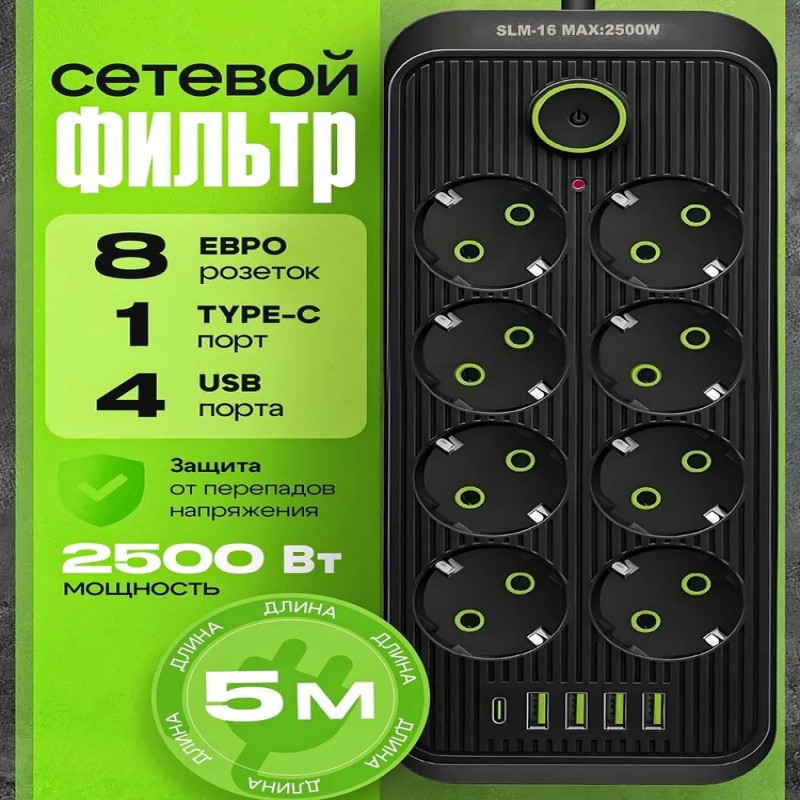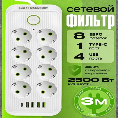 Сетевой фильтр Artdem удлинитель сетевой 3м, 2500 Вт, 8 розеток, белый