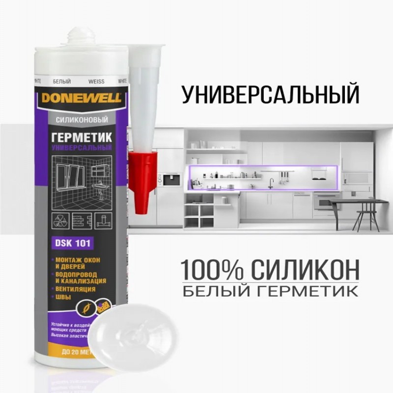 Высококачественный универсальный силиконовый герметик DONEWELL с системой отверждения ацетокси применяется в общих бытовых, ремонтных и строительных работах. Предназначен для уплотнения, соединения и защиты непористых поверхностей от проникновения воздуха и влаги; для герметизации оконных рам, дверных коробок, кабельных каналов; герметизации стыков при монтаже сантехнического оборудования, систем кондиционирования воздуха; защиты полиуретановой монтажной пены от УФ- лучей.