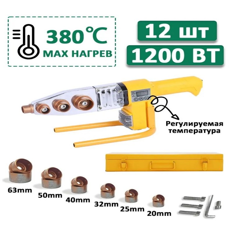 Аппарат для сварки палстиковых труб-1 шт; Подставка-1 шт; Парные сменные насадки компл.-6 шт; Имбусовый ключ-1 шт; Отверка-1 шт; Винт-4 шт; Кейс для хранения-1 шт;