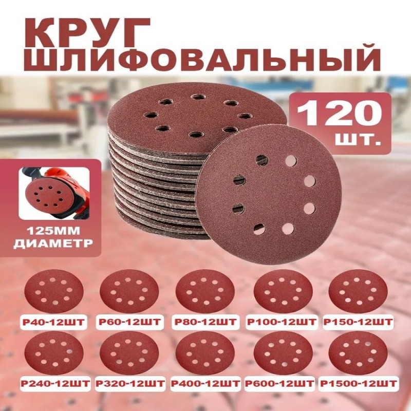 Круг шлифовальный абразивный перфорированный под липучку Р40 - 12 шт., Круг шлифовальный абразивный перфорированный под липучку Р60 - 12 шт., Круг шлифовальный абразивный перфорированный под липучку Р80 - 12 шт., Круг шлифовальный абразивный перфорированный под липучку Р100 - 12 шт., Круг шлифовальный абразивный перфорированный под липучку Р150 - 12 шт., Круг шлифовальный абразивный перфорированный под липучку Р240 - 12 шт., Круг шлифовальный абразивный перфорированный под липучку Р320 - 12 шт., Круг шлифовальный абразивный перфорированный под липучку Р400 - 12 шт., Круг шлифовальный абразивный перфорированный под липучку Р600 - 12 шт., Круг шлифовальный абразивный перфорированный под липучку Р1500 - 12 шт.