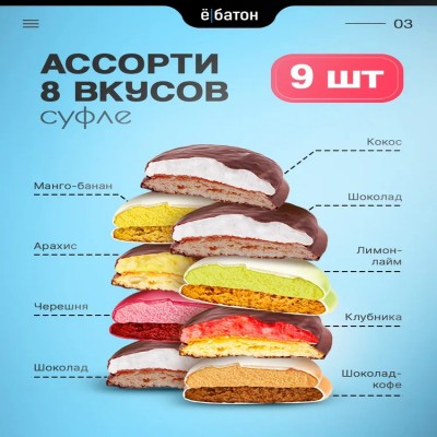Протеиновые печенья без сахара ёбатон Протеиновое печенье ё/батон с суфле – бесподобный протеиновый десерт, состоящий из 3х частей: нежнейшее белковое суфле без сахара уложено на мягкое протеиновое печенье без сахара и покрыто восхитительной шоколадной глазурью. Фитнес-десерт в виде протеинового печенья без сахара - идеален для тренирующихся и ведущих здоровый образ жизни людей. Такое протеиновое печенье порадует вас пользой, без вреда для здоровья. Рекомендации по употреблению: в перерывах между едой/быстрый перекус, как дополнительный источник легкоусвояемых белков. Противопоказания: индивидуальная непереносимость компонентов продукта.