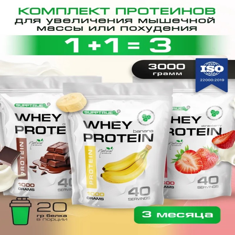 Протеин сывороточный Supptrue, набор протеинов Шоколад + Банан + Клубн
