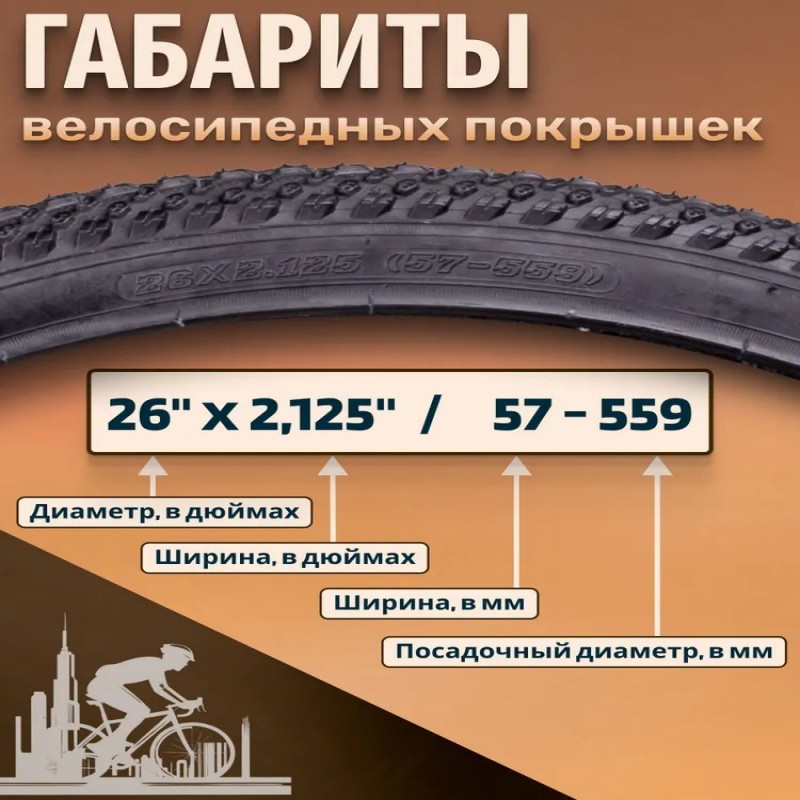 Велосипедная покрышка 26" BrainY 26x2.125 XR-001/690063. Велопокрышка 26"x2.125" XR-001 BrainY без камеры средней жесткости. Качественная велошина, предназначенная для установки на велосипеды с диаметром колес 26 дюймов. Изготовлена из прочной резины. Протектор состоит из невысоких шипов и боковых грунтозацепов. Это позволяет активно кататься как на пересеченной местности, так и в городских условиях. Размеры: 26x2.125. Высота до посадочного места: 45 мм. Цвет: черный. Вес: 560 грамм. Велопокрышка – это велосипедная шина (велосипедная покрышка). Упругая резиновая велопокрышка с металлическим или полимерным кордом устанавливается на обод колеса. Между ободом колеса и покрышкой обеспечивают воздух под давлением для гашения толчков и ударов, возникающих при движении, например - размещается камера велосипедная, которая надувается воздухом. Благодаря нагнетанию давления в велосипедные покрышки обеспечивается возможность регулировать жесткость под конкретное дорожное полотно. Покрышки обеспечивают контакт велосипеда с дорожным полотном и дополнительно поглощают незначительные толчки и удары, возникающие при движении из-за несовершенства дорожного покрытия, компенсируют погрешности траекторий колёс. Велосипедная покрышка – неотъемлемый элемент конструкции велосипеда, который в качестве составной части содержит колесо для велосипеда. Покрышка при достаке не складывается, так как присутствует металлическая проволока в корде.