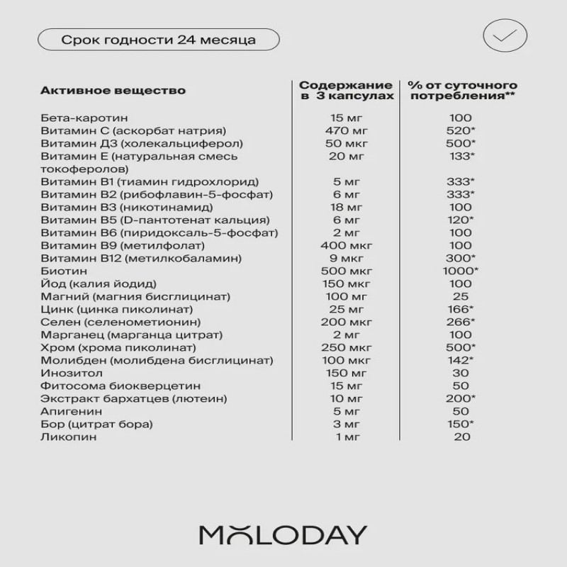 Специфические компоненты: включение уникальных элементов, таких как фитосома биокверцетин и экстракт бархатцев (лютеин), способствует поддержанию здоровья глаз, сохранения волос и антиоксидантной защите.