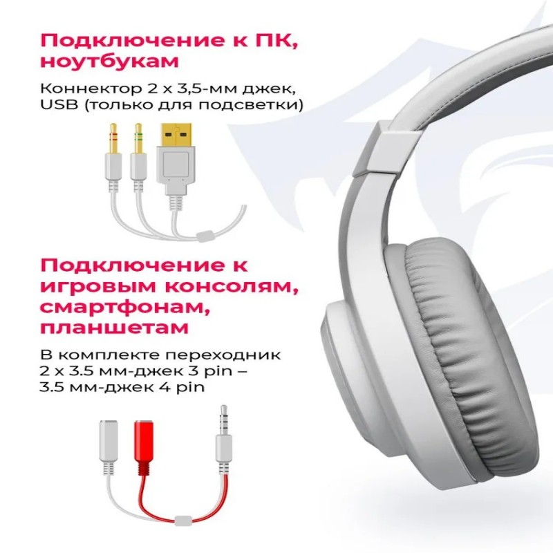 Комплектация Наушники, переходник 2*jack 3.5mm 3 pin -> 1 jack 3.5 mm 4 pin, инструкция и гарантийный талон, фирменная упаковка. Стильная белая гарнитура с RGB подсветкой и Jack 3.5". Отличное качество обеспечивают 50мм драйверы.