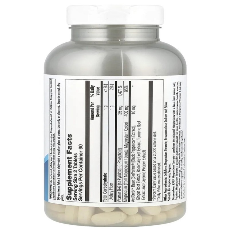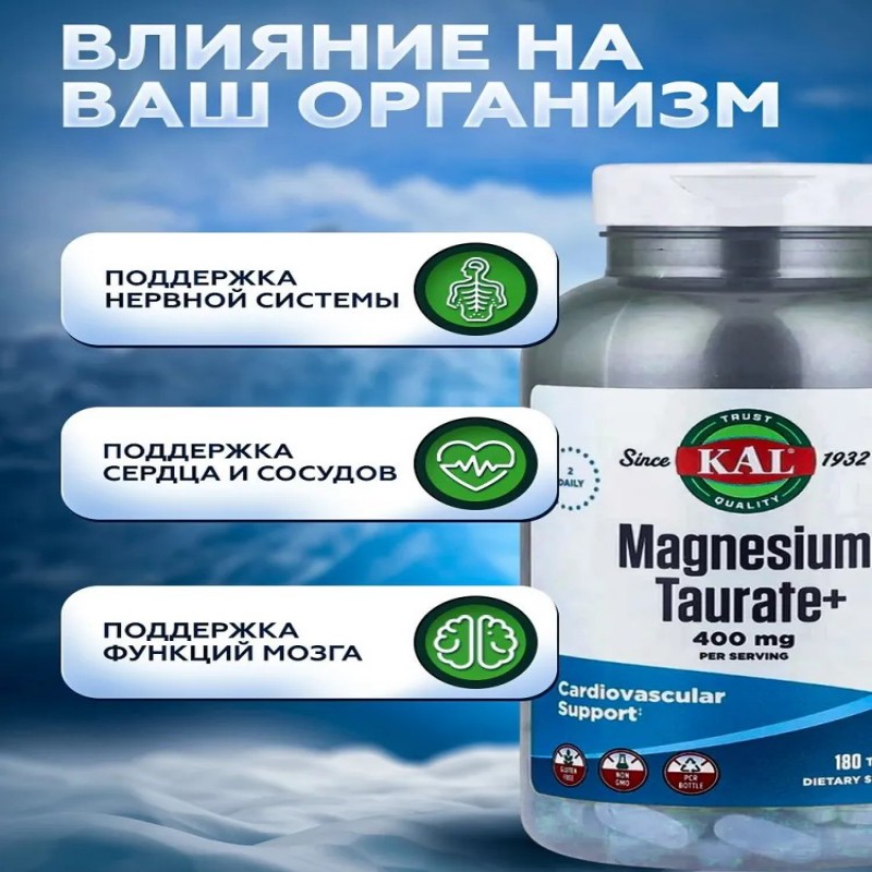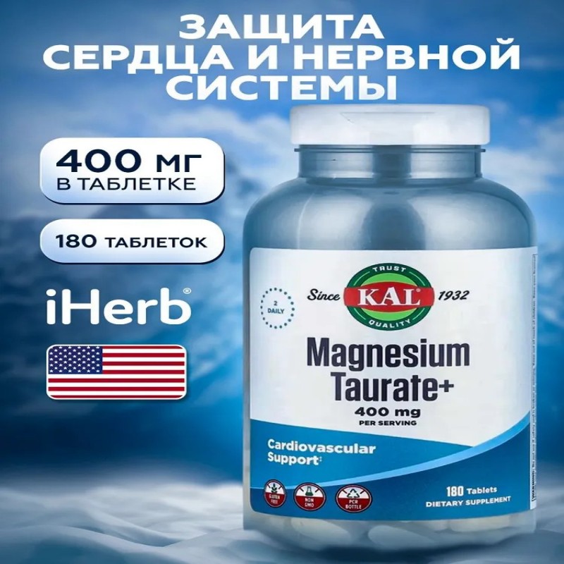 KAL Magnesium Taurate+ (400 мг, 180 таблеток) – двойная защита сердца и нервной системы. Уникальная комбинация магния и таурина для глубокого восстановления организма. KAL Magnesium Taurate+ это инновационная формула, сочетающая магний в хелатной форме и таурин – два мощных нутриента, усиливающих действие друг друга. Добавка разработана для комплексной поддержки: 1. Сердечно-сосудистой системы 2. Нервной функции 3. Энергетического метаболизма Ключевые преимущества: 1. Сердечно-сосудистая защита Нормализует сердечный ритм (профилактика аритмий) Снижает артериальное давление Укрепляет сосуды (таурин предотвращает кальцификацию) 2. Нервная система и стрессоустойчивость Глубоко расслабляет мышцы и нервную систему Уменьшает тревожность и раздражительность Улучшает качество сна 3. Энергия и метаболизм Повышает выработку АТФ (клеточной энергии) Уменьшает хроническую усталость Помогает при мышечных судорогах 4. Детокс и антиоксидантная защита Таурин защищает печень Магний участвует в 300+ ферментативных реакциях Комплекс нейтрализует свободные радикалы Таурат магния, как и другие формы магния, может использоваться для восполнения его дефицита в организме и для достижения конкретных терапевтических эффектов. Применение: Принимать по 2 таблетки 1 раз в день во время еды. Противопоказания: Индивидуальная непереносимость компонентов. При беременности и в период лактации рекомендуется проконсультироваться у специалиста.
