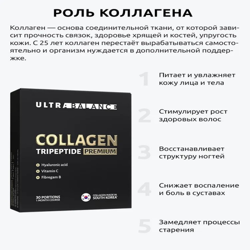 Collagen Tripeptide Premium от компании Ultra Balance производится из высококачественного морского низкомолекулярного трипептид коллагена из Кореи. С гиалуроновой кислотой, витамином С и фибрегам В. Производство сертифицировано по международным стандартам GMP и ISO 22000.