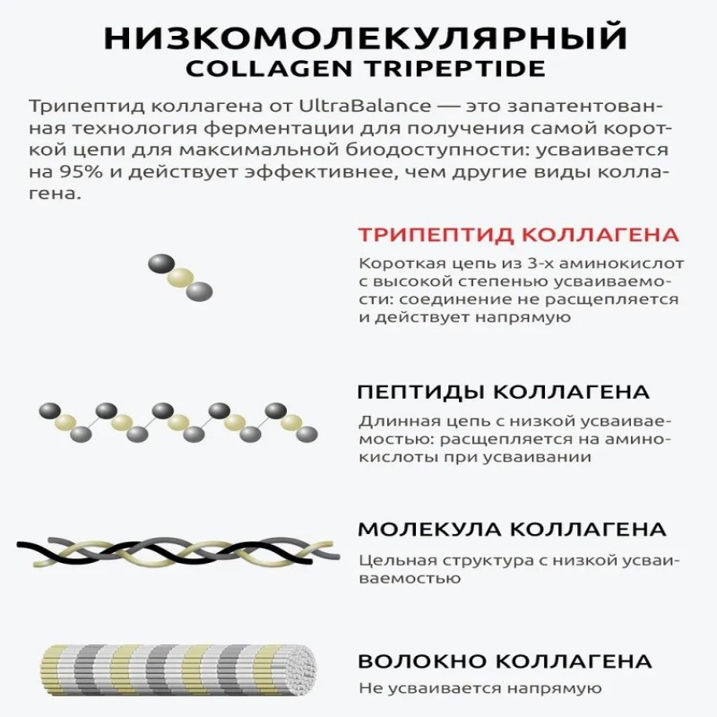 Низкомолекулярный пищевой коллаген Ультра Баланс — лидер по усваиваемости. Запатентованный компонент корейского производства состоит всего из 3-х аминокислот и за счет своих малых размеров проникает в ткани лучше, в сравнении с другими видами: животный говяжий, куриный (на основе исследований компании-производителя).