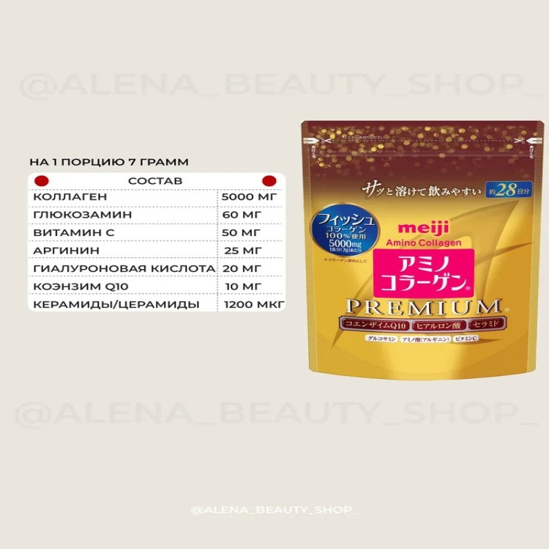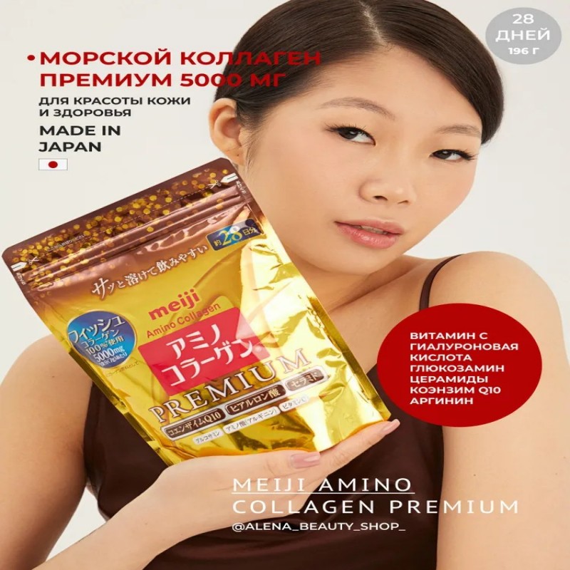 АМИНО КОЛЛАГЕН порошок МОРСКОЙ ПРЕМИУМ ЯПОНИЯ MEIJI - превосходное сочетание самых необходимых для поддержания красоты ингредиентов, включая гиалуроновую кислоту, керамиды (для увлажнения) и коэнзим Q10.