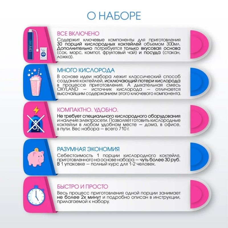 Набор OXYLAND «Универсальный» создан экспертами в области кислородных коктейлей и позволит каждому желающему самостоятельно приготовить настоящие кислородные коктейли, без приобретения дорогостоящего кислородного оборудования и даже без наличия электросети.