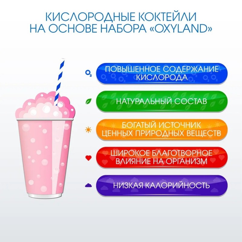 В основе идеи набора лежит классический способ приготовления кислородных коктейлей. Источником кислорода является кислородная газовая смесь OXYLAND, а пенообразующим компонентом - специальная сухая смесь (композиция), которая отличается великолепным пенообразованием, имеет нейтральный вкус, поэтому позволяет готовить кислородные коктейли с разными вкусами на основе соков, морсов, компотов.