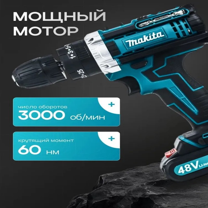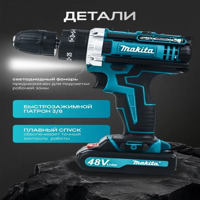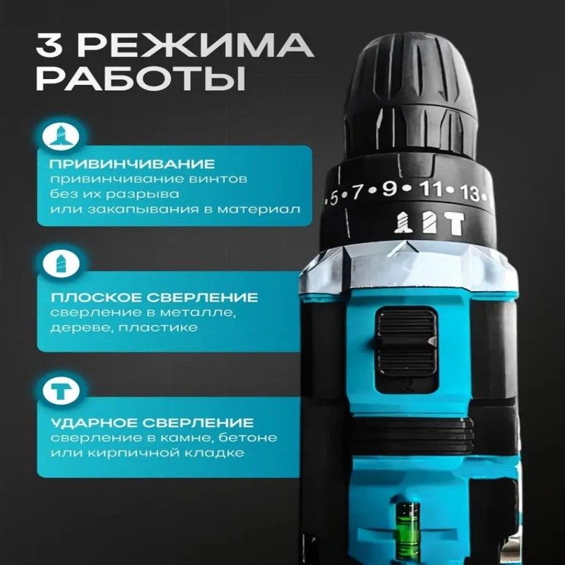КомплектацияШуруповёрт 6 насадок 6 сверл 9 головок торцевых Переходник для бит Гибкий вал Зарядное устройство 2 аккумулятора Удобный кейс.