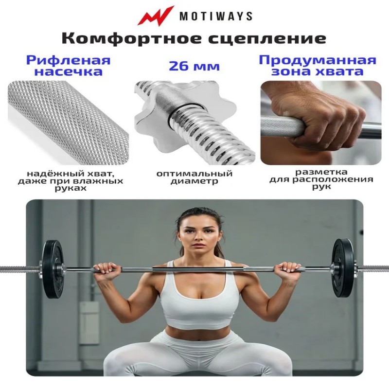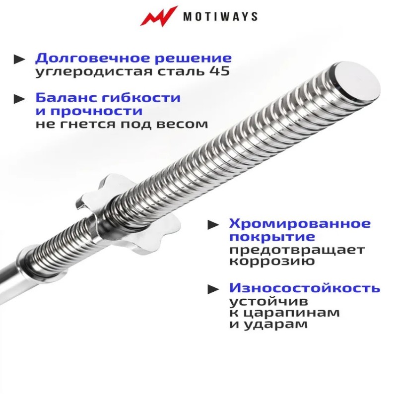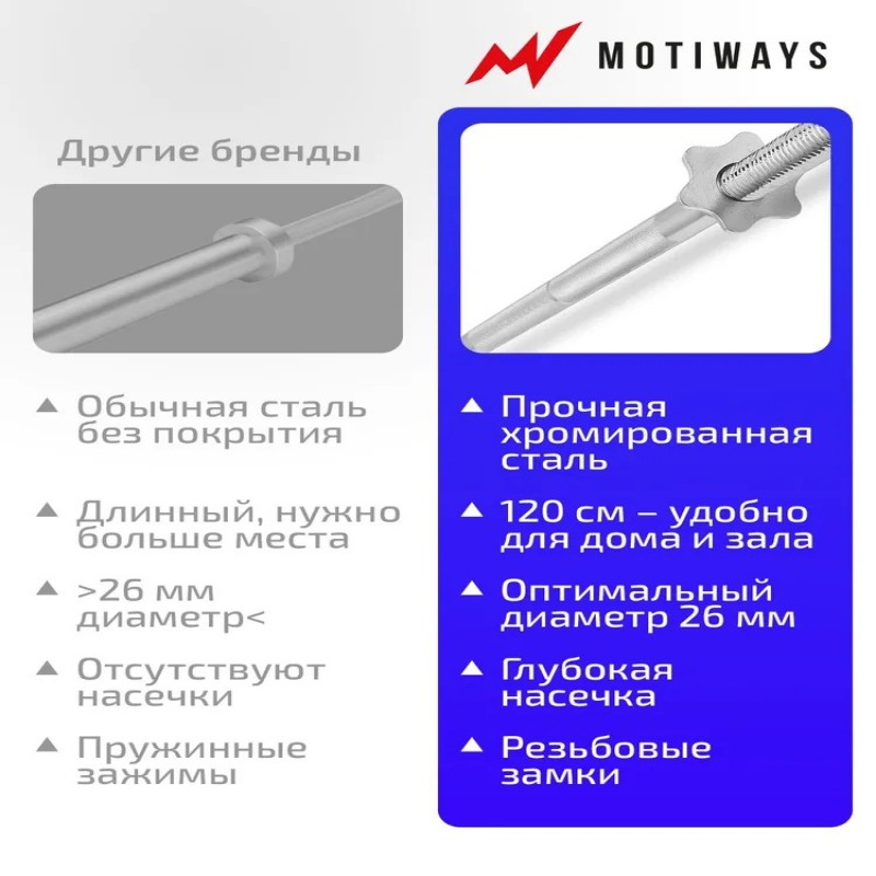 Гриф для штанги 120 см прямой стальной MOTIWAYS для тяги и приседаний,