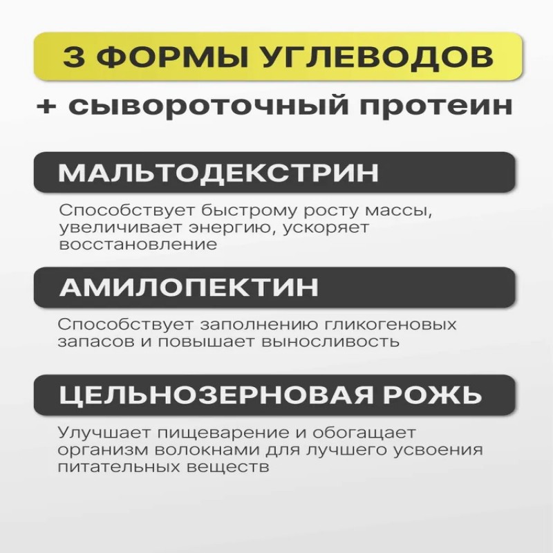 В состав gainer входит сывороточный белок, который обеспечивает необходимое количество белка на один прием пищи. Сывороточный белок в составе обеспечивает быстрое усвоение. Важное преимущество данного продукта - присутствие быстрых и медленных углеводов в составе, что позволяет быстро набрать массу, от 3кг- 5кг за 21 день! Профессиональное спортивное питание имеет уникальный состав, в который входит 3 типа углеводов - медленные ( сложные ), быстрые и сверхбыстрые. Амилопектин относится к сверхбыстрым углеводам и обеспечивает мгновенное наполнение. Мальтодекстрин - это классический быстрый и цельнозерновая рожь - сложные углеводы. Высокоуглеводный порошок - идеальный комплекс с добавками для тренировок спортсменов.
