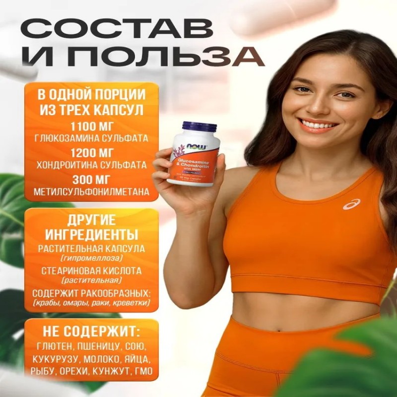 Глюкозамин, хондроитин и МСМ от NOW - это комплекс, который разработан для улучшения здоровья суставов и их восстановления. БАД составлен из натуральных компонентов, включая глюкозамин, хондроитин и метилсульфонилметан (MSM), которые взаимодействуют между собой для максимальной эффективности. Преимущества включают в себя: Снижение воспаления благодаря антивоспалительному действию МСМ и постепенному восстановлению поврежденной ткани. Улучшение подвижности суставов, увеличение свободы движения и уменьшение симптомов функциональных нарушений. Укрепление хрящевой ткани и связок суставов, снижение риска получения травм при физических нагрузках и более быстрое восстановление после повреждений опорно-двигательного аппарата Этот препарат предназначен для взрослых, а детям и беременным женщинам следует принимать его только после консультации с врачом. У нас есть акции и распродажи, вы можете купить наши товары в подарок со скидкой!