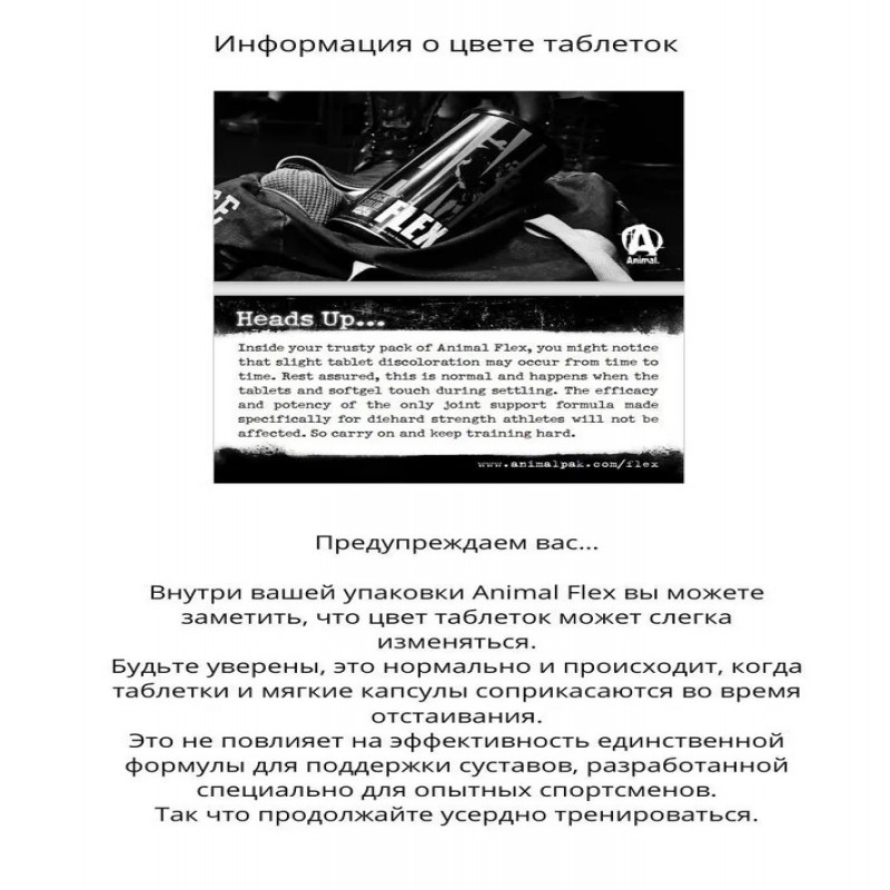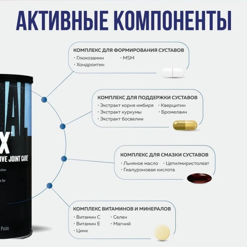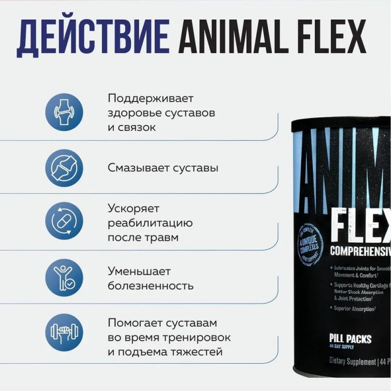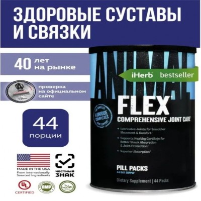 Витаминно-минеральный комплекс Animal Flex для суставов и связок.Animal Flex – это мощный витаминный комплекс, созданный для поддержки суставов и связок. Его инновационная формула идеально подходит как мужчинам, так и женщинам, укрепляя суставы, снимая воспаления и помогая справляться с нагрузками во время тренировок. Данный мультивитаминный комплекс сочетает в себе лучшие компоненты, чтобы восстановить соединительные ткани, защитить суставы и улучшить общее состояние организма.Основные преимущества Animal Flex: