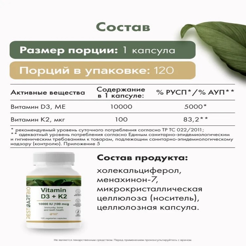 RESTARTBIO , витамин D3 с K2 (10000МЕ/100мкг), БЕЗ вредных компонентов в составе.