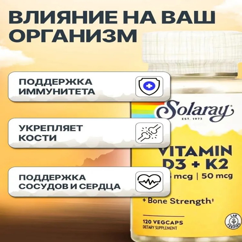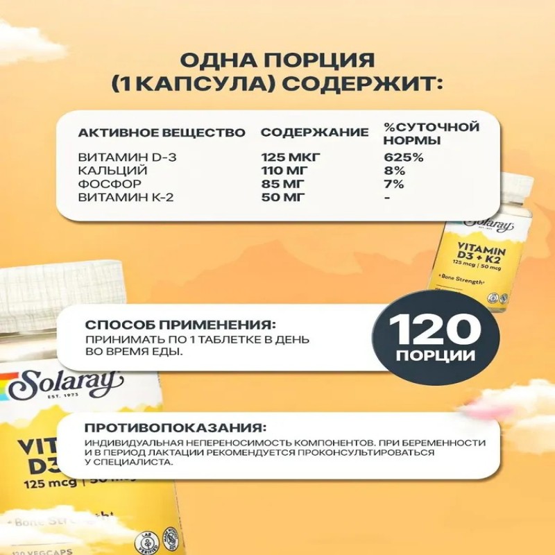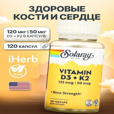 Витамины D3 и K2 считаются важными для поддержания здоровья костей и сердечно-сосудистой системы. Они часто принимаются вместе, поскольку работают синергетически: Витамин D3: 1. Усвоение кальция и фосфора: Витамин D3 улучшает усвоение кальция и фосфора из пищеварительного тракта, что важно для формирования и поддержания крепких костей и зубов. 2. Поддержка иммунной системы: Он помогает в регуляции иммунной системы и уменьшении воспаления. 3. Профилактика хронических заболеваний: D3 может снизить риск развития некоторых хронических заболеваний, включая сердечно-сосудистые и аутоиммунные болезни, а также некоторые виды рака. Витамин K2: 1. Распределение кальция: К2 помогает контролировать, куда поступает кальций в организме, направляя его в кости, а не в мягкие ткани, такие как сосуды и почки, где его отложение может быть вредным. 2. Здоровье костей: Он активно участвует в минерализации костной ткани, что важно для предотвращения остеопороза. 3. Поддержка сердечно-сосудистой системы: Витамин K2 может предотвращать атеросклероз за счет предотвращения отложения кальция в стенках артерий. Совместный прием витаминов D3 и K2 может быть более эффективным для здоровья костей, чем прием каждого из них по отдельности. Применение: Принимать по 1 таблетке в день во время еды. Противопоказания: Индивидуальная непереносимость компонентов. При беременности и в период лактации рекомендуется проконсультироваться у специалиста.