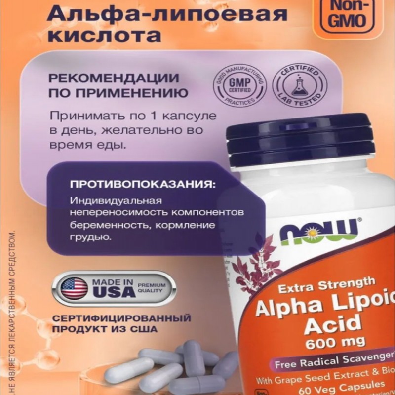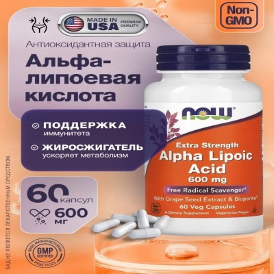 Альфа-липоевая кислота (АЛК) естественным образом вырабатывается в организме человека в очень небольших количествах, но также присутствует в некоторых продуктах питания. АЛК уникальна тем, что она может действовать как в водной, так и в жировой среде. АЛК способствует выработке глутатиона, а также может перерабатывать витамины C и E, тем самым повышая их антиоксидантные свойства. Кроме того, АЛК способствует здоровью нервных тканей, нормальному метаболизму глюкозы и поддерживает здоровье сердечно-сосудистой системы.Этот продукт с повышенной силой действия содержит больше альфа-липоевой кислоты (600 мг на капсулу), чем наш продукт обычного действия (100 мг на капсулу).Рекомендации по применению: Принимать по 1 капсуле в день, желательно во время еды.Другие ингредиенты: Гипромеллоза (целлюлозная капсула), стеарат магния (растительного происхождения) и диоксид кремния.При изготовлении этого продукта не используются пшеница, глютена, соя, молоко, яиц, рыба, ракообразные и ингредиенты из древесных орехов. Производится на предприятии, имеющем регистрацию GMP, где обрабатываются другие ингредиенты, содержащие эти аллергены.Предупреждения. Только для взрослых. Перед применением во время беременности, лактации, приема лекарств (особенно инсулина или лекарства, предназначенные для лечения диабета) или при наличии каких-либо заболеваний (особенно диабета) следует проконсультироваться с врачом. Хранить в недоступном для детей месте.Продукт может естественным образом менять цвет.После вскрытия упаковки хранить в сухом и прохладном месте.НЕ ЯВЛЯЕТСЯ ЛЕКАРСТВЕННЫМ ПРЕПАРАТОМ!