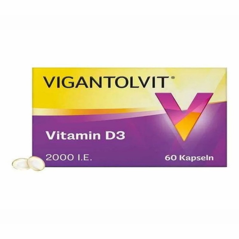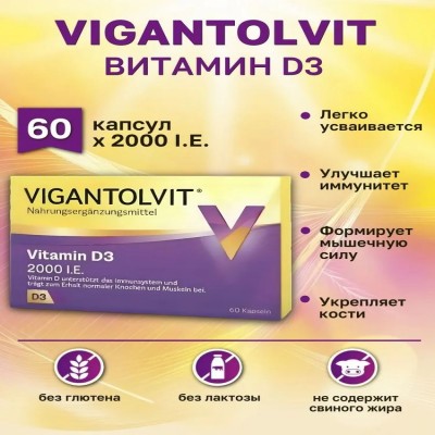 VIGANTOLVIT – Витамин D3: Форма выпуска: 60 капсул по 2000 I.E. - Легко усваивается: Обеспечивает организм необходимым витамином D с высокой биодоступностью. - Улучшает иммунитет: Поддерживает и укрепляет защитные функции организма. - Формирует мышечную силу: Способствует нормальной функции мышц и укреплению их силы. - Укрепляет кости: Поддерживает здоровье костной системы и помогает предотвратить болезни, связанные с недостатком витамина D. Дополнительные преимущества: - Без глютена - Без лактозы - Не содержит свиного жира Поддержите ваше здоровье с VIGANTOLVIT!