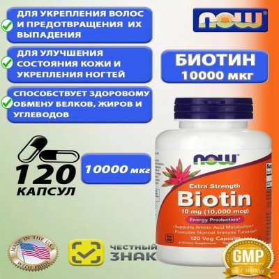 NOW Biotin 10000 mcg Биотин 120 капсул, Здоровые волосы, кожа, ногти