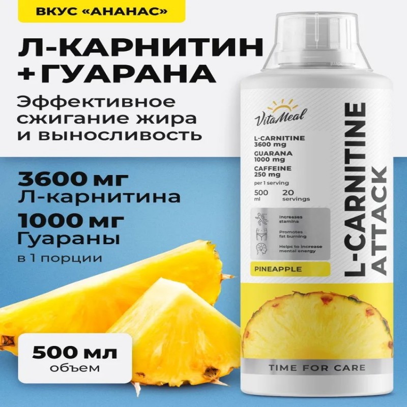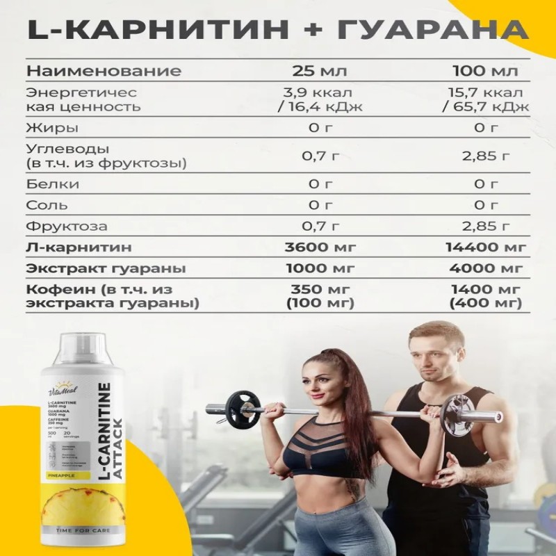 L карнитин + гуарана от VitaMeal - это жидкий концентрированный сироп со вкусом, без сахара, содержащий Л-карнитин + гуарана и кофеин. Этот продукт предназначен для ускорения процесса сжигания жира, повышения энергии и выносливости во время тренировок. Эти эффекты достигаются за счет компонентов Attack: Л-карнитин - это вещество способствует преобразованию жира из запасов организма в энергию во время физической активности с повышенным пульсом. Экстракт гуараны - это натуральный источник кофеина из одноименного растения.