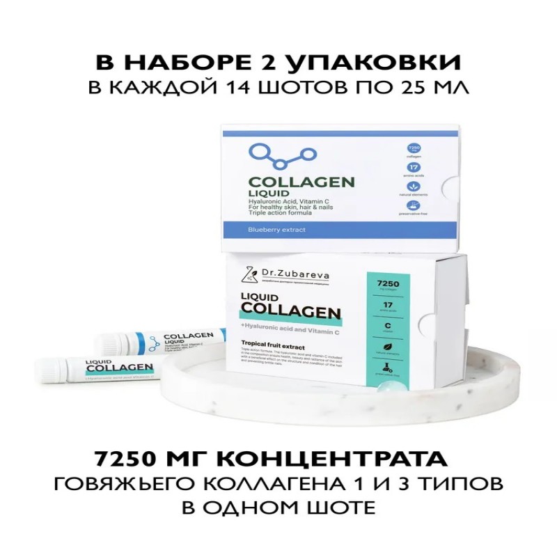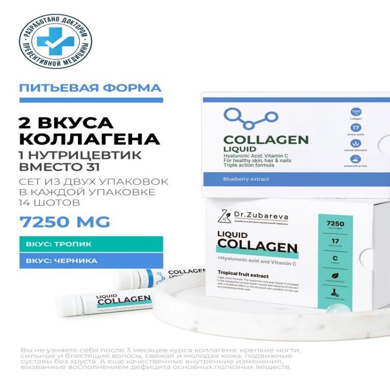 Питьевой говяжий коллаген Dr. Zubareva — современный функциональный напиток для женщин и мужчин, созданный для поддержки суставов, кожи, волос и общего здоровья. Формула обогащена гиалуроновой кислотой, витаминами A, B, C, D, E и натуральным вкусом. Удобный формат в виде 28 питьевых шотов по 25 мл представлены в виде сет-набора из 3 разных вкусов.