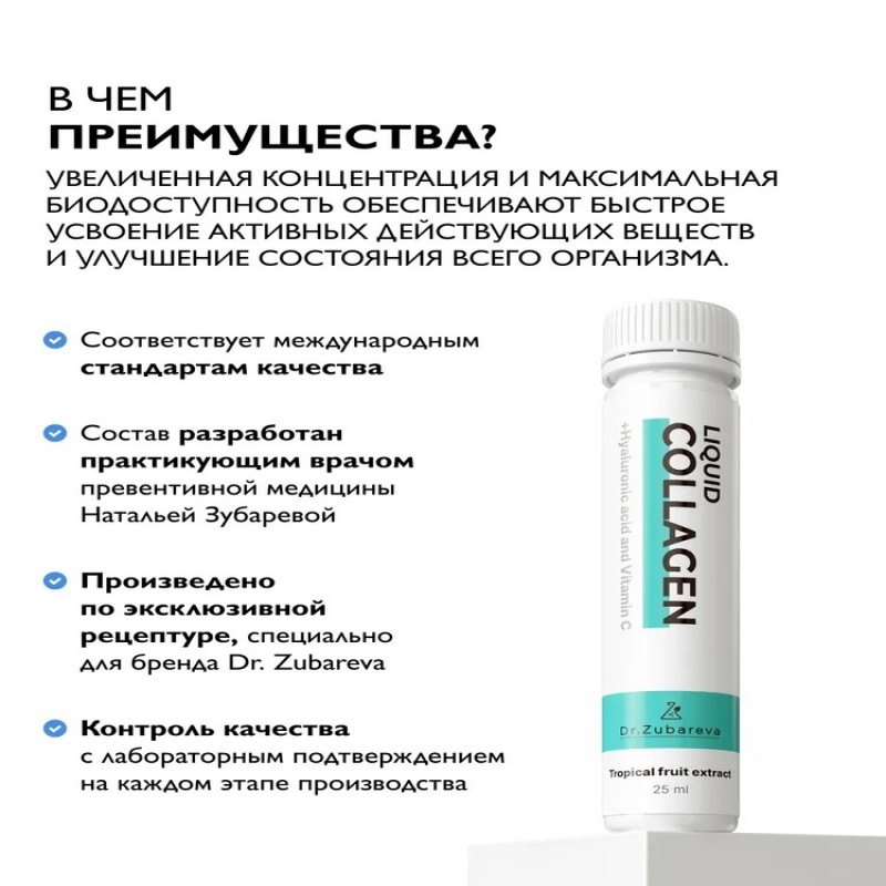 Продукт разработан под контролем Натальи Зубаревой — врача, нутрициолога и эксперта по превентивной медицине. Все препараты бренда создаются при участии специалистов, проходят сертификацию и производятся на российских предприятиях из высококачественного зарубежного сырья (Япония). Dr. Zubareva выпускает натуральные комплексы в жидкой форме, капсулах и напитках — без сложных схем и побочных эффектов.