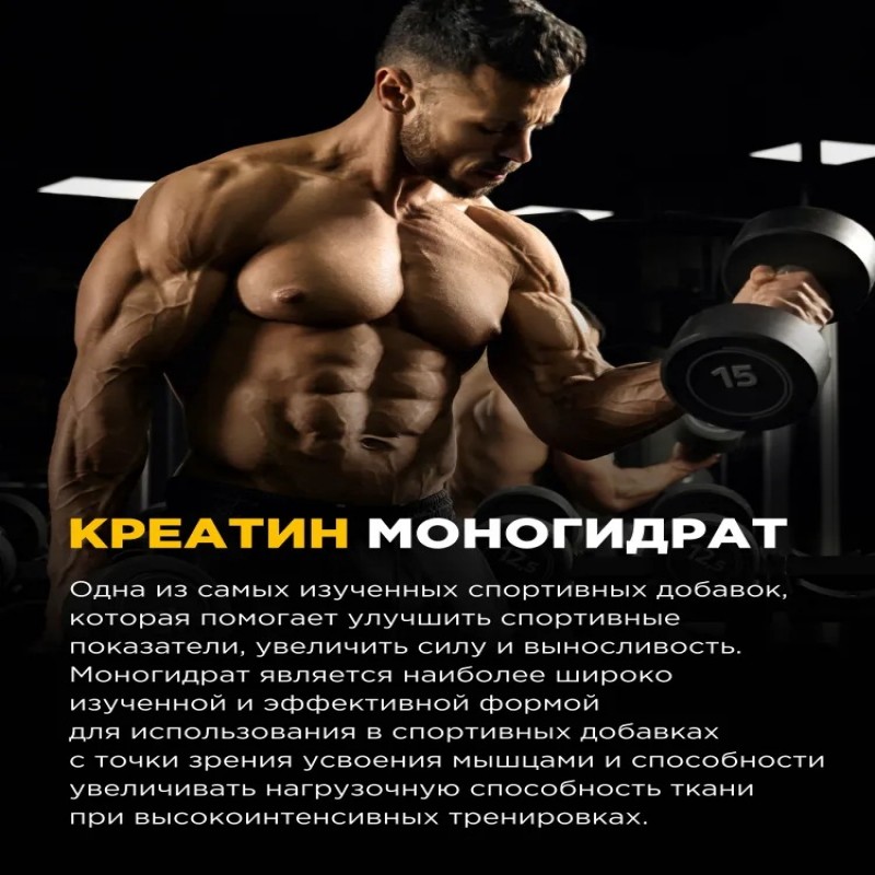 1️⃣Силовые виды спорта (пауэрлифтинг, тяжелая атлетика, бодибилдинг и т.п.) – для увеличения силы и набора мышечной массы. Креатин повышает запасы фосфокреатина в мышцах, что ускоряет ресинтез АТФ – основного источника энергии при тяжелых подходах, что позволяет поднимать большие веса и улучшать скорость выполнения.