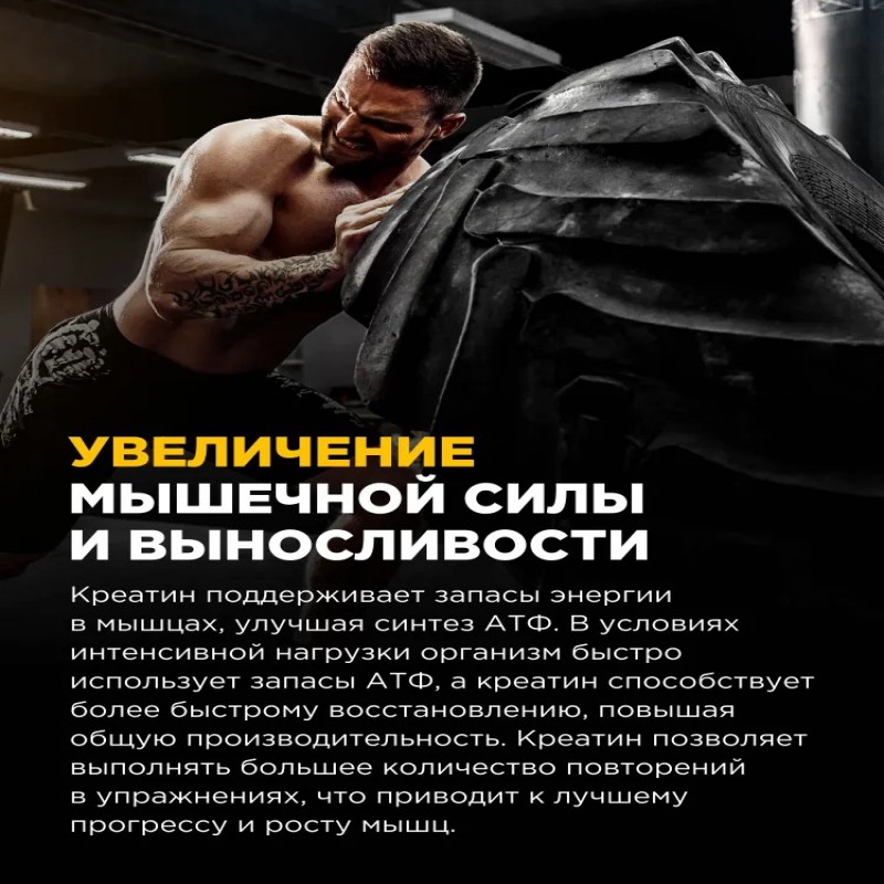 1️⃣Увеличивает силу и мощность – помогает быстрее восстанавливать АТФ (основной источник энергии для мышц), что улучшает показатели в силовых и взрывных упражнениях.