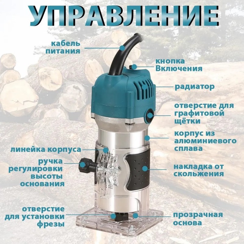 - Линейка в боковой части корпуса: на корпусе фрезера выгравированы шкалы для регулировки глубины обработки дерева и других материалов.