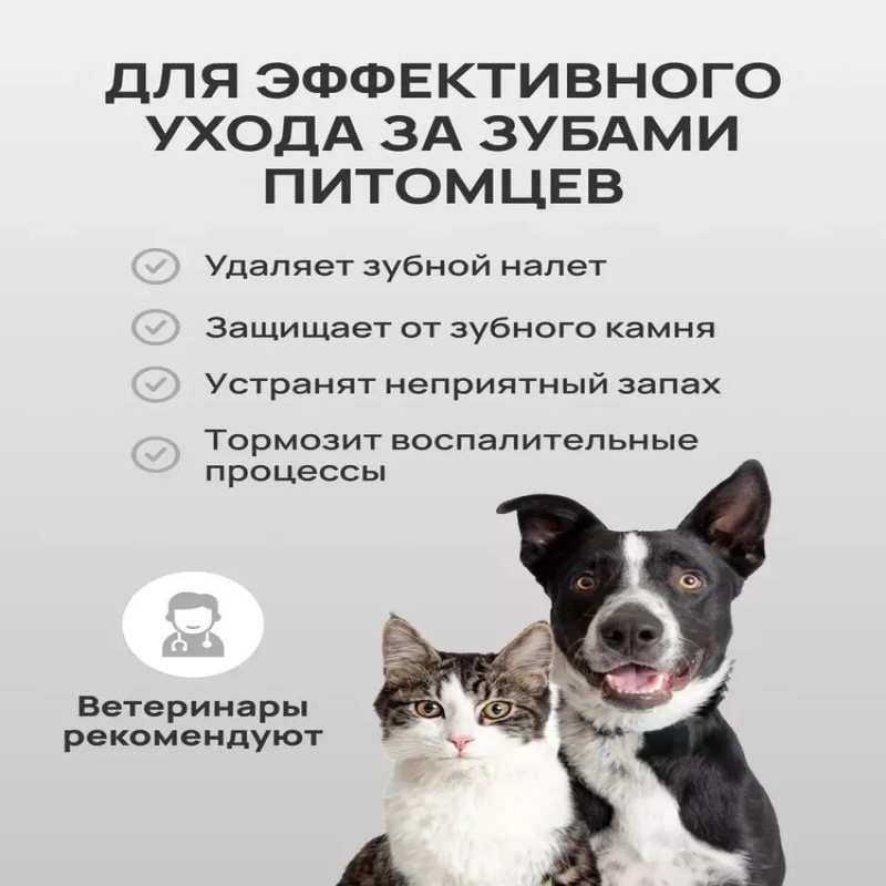Идеален после профессиональной чистки Поддерживает результат после ветеринарной обработки, препятствует повторному образованию зубного налёта.