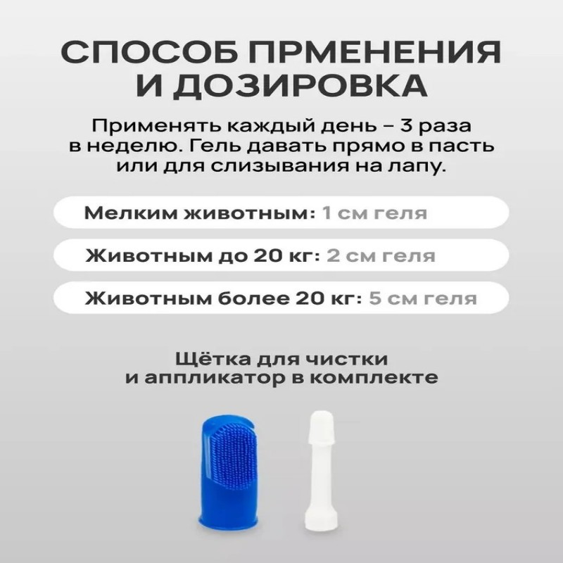 Прост в применении Наносится прямо в пасть животного. При необходимости — распределяется по зубам и деснам для усиленного действия. Аппликатор в комплекте упрощает нанесение мелким питомцам.
