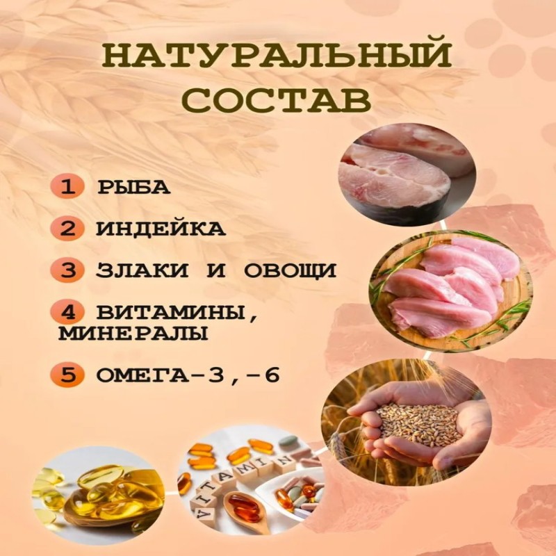 СоставРыба цельная свежая Мука из зерновых культур Дегидратированная индейка Подсолнечник переработанный подготовленный Пульпа свеклы Масло подсолнечное Рыбий жир Экстракт шиповника Витаминно-минеральный комплекс Монокальцийфосфат Витаминно-минеральный комплекс: A 2500 ME/кг, D3 700 ME/кг, E 80 мг/кг, K3, B1, B2, B3, B5, B6, B12, BC, C, H Железо, медь, цинк, марганец, кобальт, йод, селен Показатели питательности: сырой протеин - 20%, сырой жир - 7%, сырая клетчатка - 4,4%, кальций - 1,2%, фосфор - 0,8%, Омега 3 жирные кислоты - 0,5%, Омега 6 жирные кислоты - 2,8%, энзим, фитаза Энергетическая ценность (100г) – 358 ккалКомплектацияУпаковка; Корм