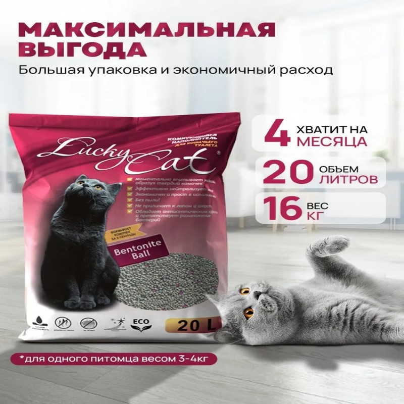 Кошачий наполнитель для туалета Лаки Кэт изготовлен из современного, экологичного сырья класса premium. Это бентонитовая глина вулканического происхождения. Содержание в глине монтмориллонита достигает почти 97%. Это очень большой показатель, который напрямую влияет на качество и скорость формирования прочных комочков. Это делает бентонитовый наполнитель очень экономичным в применении, и позволяет вам покупать наполнитель реже, и сохранять ваш бюджет. Комкующийся наполнитель Лаки Кэт (бентонит) моментально впитывает всю жидкость и формирует прочный комок за 3 секунды - Блокирует самые резкие запахи. Обеспылен на 99% . Абсолютно безопасный для животных и людей, даже при попадании внутрь организма. Не вызывает аллергию. Очень экономичный расход. Упаковки 20л хватает на 4 месяца, упаковки 10л - почти на 2 месяца использования для кошки весом до 5кг. Идеален для не кастрированных котов, eco нейтрализатор с добавлением активированного угля для лучшего удаления едких запахов. Глиняный наполнитель Лаки Кэт отлично помогает в приучении котят к туалетным делам, это лучший наполнитель для приучения кошки к лотку. С комкующимся наполнителем Lucky cat содержание питомца в доме станет для вас простым и максимально комфортным. К тому же, это наполнитель, который очень нравится кошкам. Ваш питомец будет с большим удовольствием посещать лоток, и делать свои дела исключительно в нужном месте. Поистине лучшее средство от запаха мочи, в вашем доме не будет ни намека, на то, что есть кошка. Чистота и комфорт обеспечены!