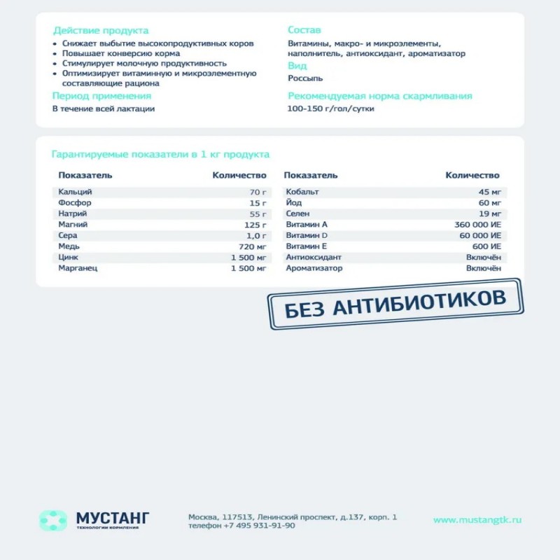 Состав Витамины, макро- и микроэлементы, наполнитель, антиоксидант, ароматизатор Комплектация бумажный трехслойный мешок с полиэтиленовым вкладышем Базовый витаминно-минеральный премикс для лактирующих (дойных) коров.