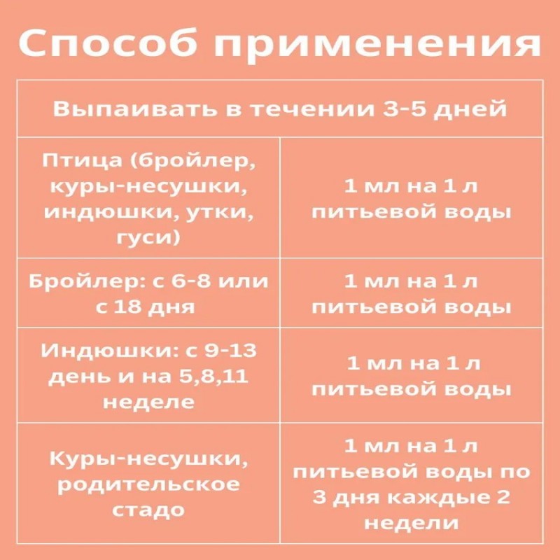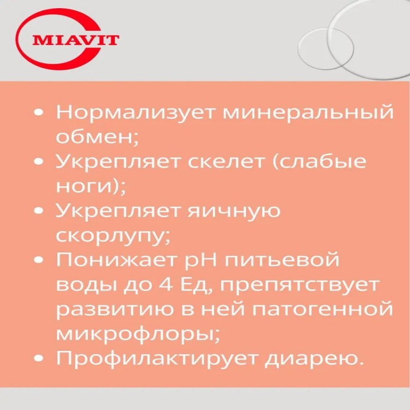 Миафос имеет кислую рН (1,5), что способствует подкислению воды и препятствует развитию патогенных микроорганизмов, в том числе E. coli, в системе поения.