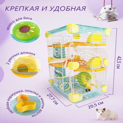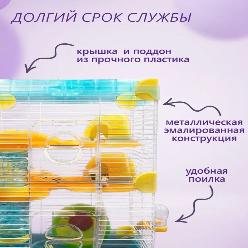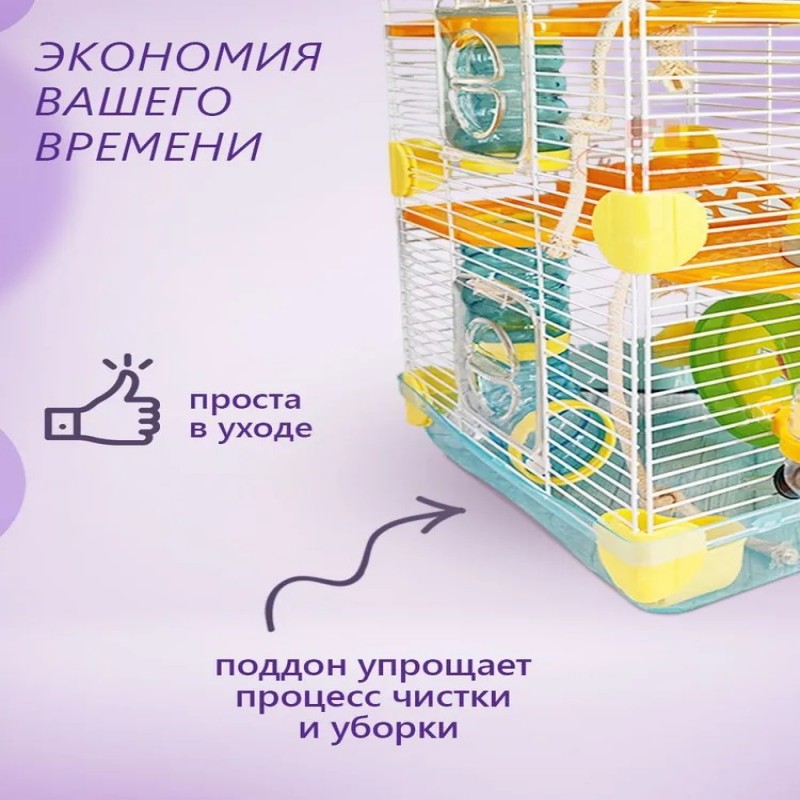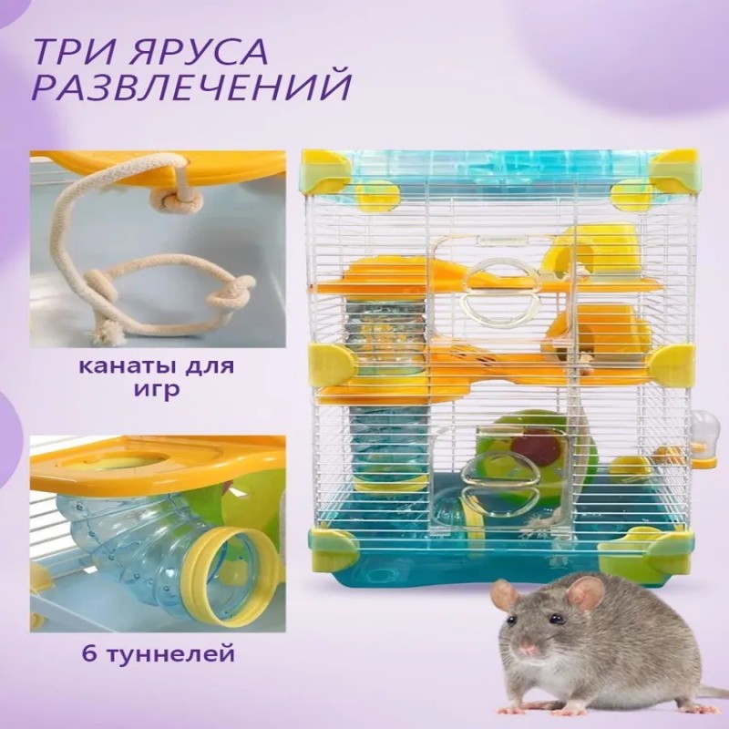 Крыша – 1 шт. Прочная крыша обеспечивает долговечность конструкции. Клетка – 1 шт. Просторная металлическая клетка, устойчивая и долговечная, идеально подходит для маленьких пород крыс, мышей и хомячков. Этажные платформы – 2 шт. Дополнительные уровни создают больше места для активного передвижения и игр питомцев, обеспечивая им интересное пространство. Быстросъемный поддон – 1 шт. Поддон с легким съемом значительно упрощает процесс уборки, позволяя быстро поддерживать чистоту. Элементы тоннеля – 6 шт. Веселые тоннели добавляют питомцам разнообразия и позволяют организовать активный отдых. Скрепления для тоннеля – 5 шт. Домик – 2 шт. Уютные домики создают комфортное укрытие для отдыха, давая вашим питомцам место для сна. Канат – 2 шт. Прочные канаты способствуют физической активности, помогая питомцам тренировать ловкость. Кормушка – 1 шт. Удобная кормушка обеспечивает легкий доступ к пище, способствуя комфортному кормлению. Поилка – 1 шт. Надежная поилка всегда предоставляет воду. Беговое колесо – 1 шт. Активный аксессуар для поддержания физической формы и развлечений, важный элемент для здорового образа жизни грызунов.