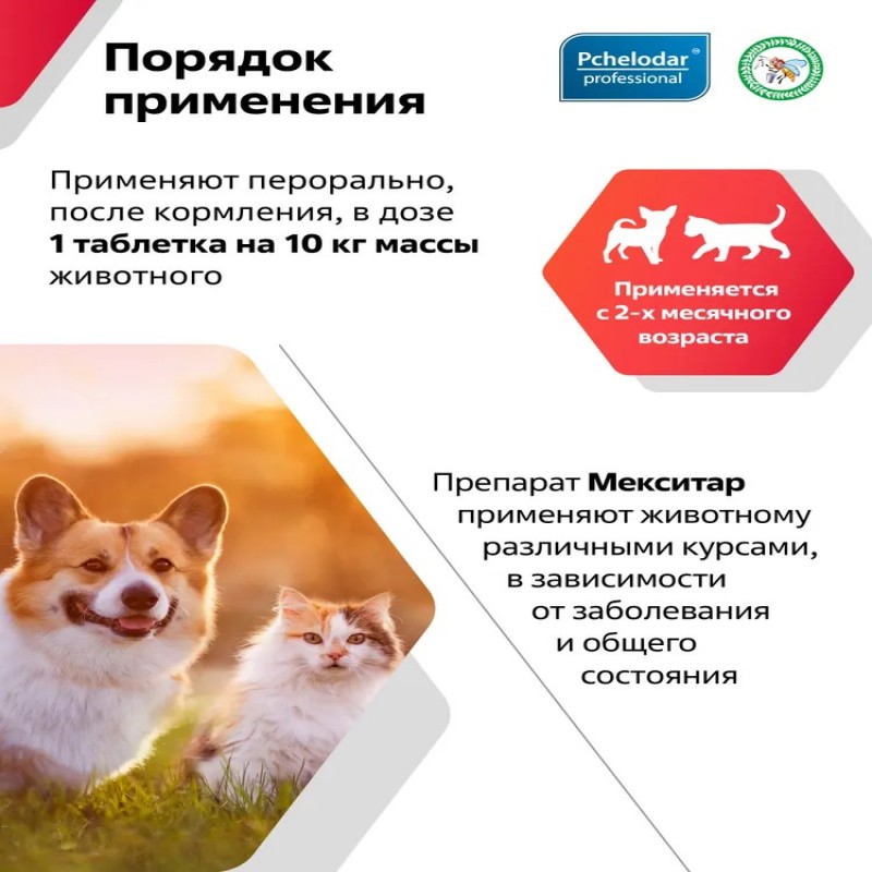Лекарственный препарат Мекситар применяют собакам и кошкам перорально, после кормления, в дозе 1 таблетка на 10 кг массы животного. Доза и длительность применения лекарственного препарата зависят от физиологического состояния животного, характера и тяжести заболевания. При лечении сердечно-сосудистой и сердечно-легочной недостаточности и интоксикациях лекарственный препарат Мекситар применяют 2-3 раза в сутки в течение 10-14 дней, далее -1 раз в сутки в течение 10-14 дней. В целях профилактики наркозных и постнаркозных осложнений лекарственный препарат применяют 2 раза в сутки за 4-5 дней до операции и в течение 4-5 дней после ее проведения. При энцефалопатиях различного генеза, черепно-мозговых травмах, экзогенно-органических заболеваниях головного мозга и острых нарушениях мозгового кровообращения лекарственный препарат применяют 2 раза в сутки в течение 1 -3 месяцев. При астенических состояниях, которые могут возникать у истощенных, ослабленных, пожилых и подвергающихся воздействию стрессорных факторов и повышенным физическим нагрузкам животных, лекарственный препарат применяют 1 раз в сутки в течение 1 месяца. При необходимости курс приема лекарственного препарата повторяют с интервалом 3-4 месяца. При таурин-дефицитной недостаточности у животных лекарственный препарат применяют 2 раза в сутки в течение 3-6 месяцев. Особенностей действия лекарственного препарата при его первом применении и отмене не установлено. Следует избегать нарушений доз и курса применения лекарственного препарата, так как это может привести к снижению его эффективности. В случае пропуска одной или нескольких доз лекарственного препарата, его применение необходимо возобновить в предусмотренной дозе и схеме применения.
