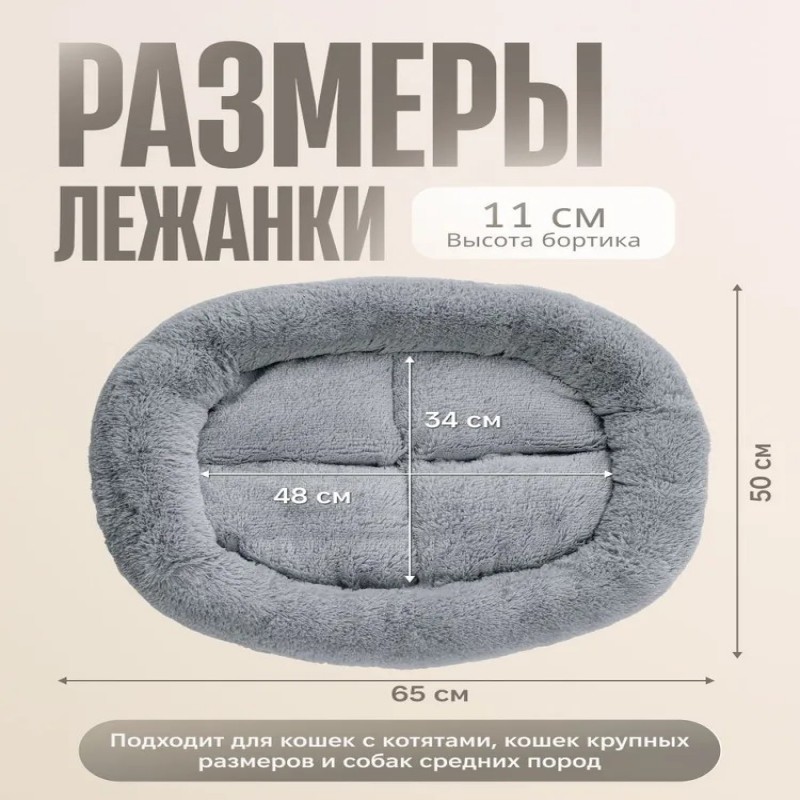 Лежанка для животных 65×50 см — овальная, с бортиками, мягкая, для кошек с котятами и собак средних пород