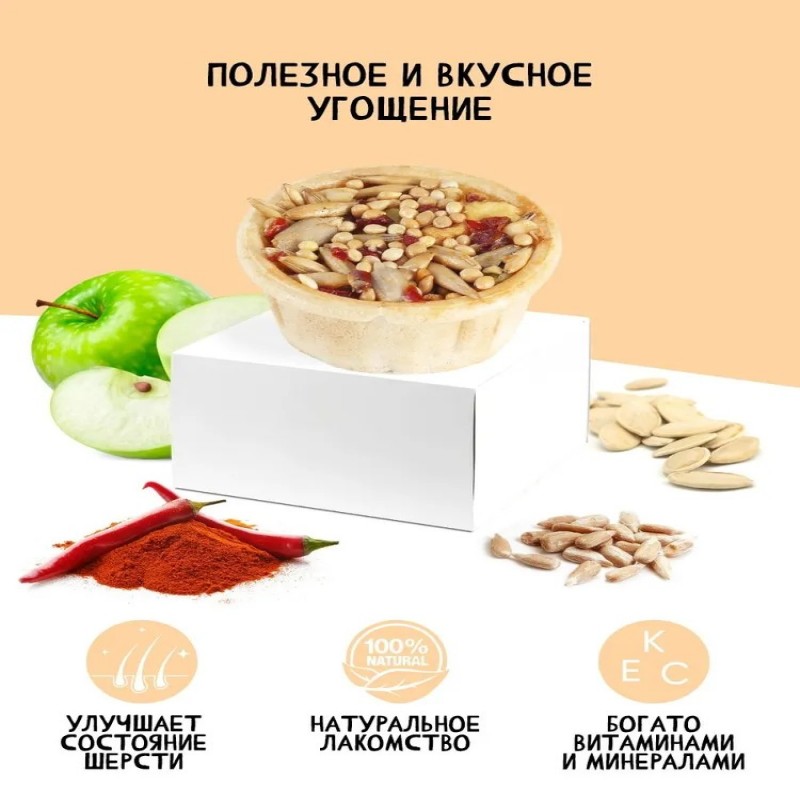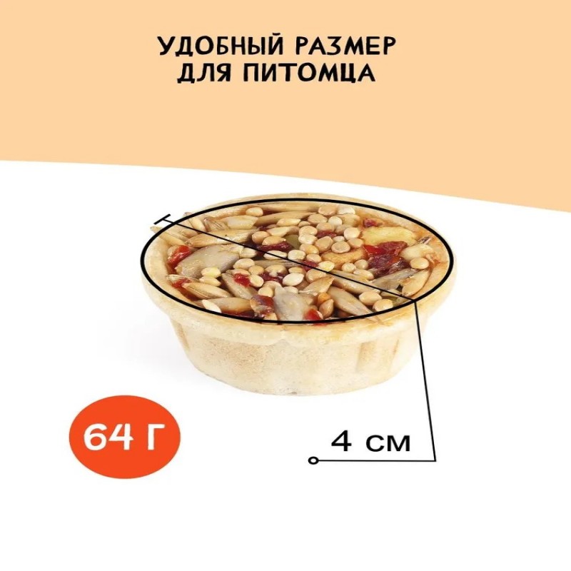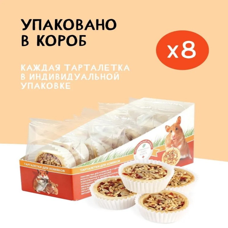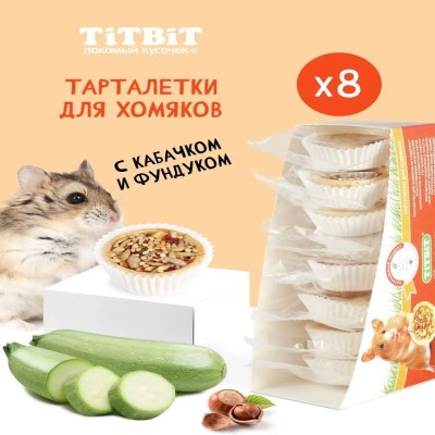 Тарталетки представляют собой корзиночки из хрустящего пресного теста с лакомой и полезной для грызунов начинкой. Обогащают ежедневный рацион витаминами, макро – и микроэлементами. Продукт не содержит искусственных красителей и ароматизаторов. Входящий в состав продукта кабачок легко усваивается организмом животного, содержит много полезных микроэлементов, оказывает положительное действие на нервную систему и регенерацию кожи. Фундук богат витамином Е и содержит фолиевую кислоту, необходимую для организма грызуна.