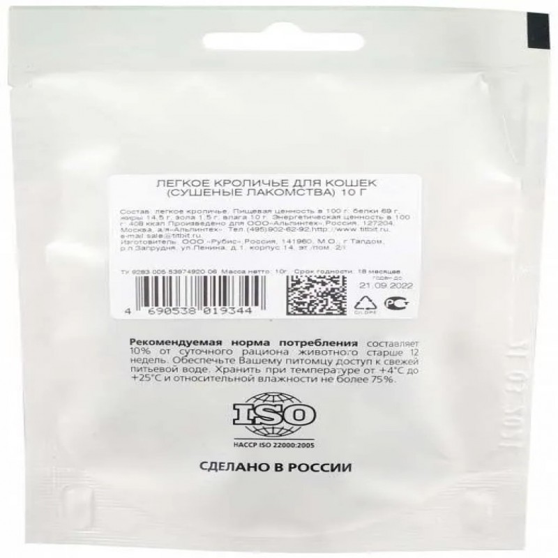 Лакомство TiTBiT Лакомый кусочек легкое кроличье для кошек, 10 г Легкое кроличье для кошек - диетическое лакомство, отличающееся высоким содержанием белка, железа, витаминов группы В. В него входят в достаточном количестве калий, фосфор, магний и другие минеральные вещества, что способствует поддержке организма животного в отличном состоянии. Состав: легкое кроличье. Пищевая ценность: в 100 г: белки 69 г, жиры 14,5 г, зола 1,5 г, влага 10 г. Энергетическая ценность в 100 г: 408 ккал Срок годности 12 месяцев. Хранить при температуре от +4 С до +25 С и относительной влажности не более 75%..