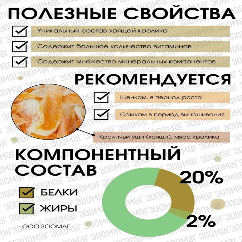СОСТАВ: кроличьи уши (хрящи), мясо кролика, картофельный крахмал, глицерин, соль. (добавление курицы) КОМПОНЕНТНЫЙ СОСТАВ: белки - 26%, жиры - 4%
