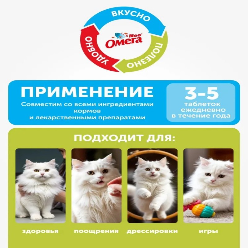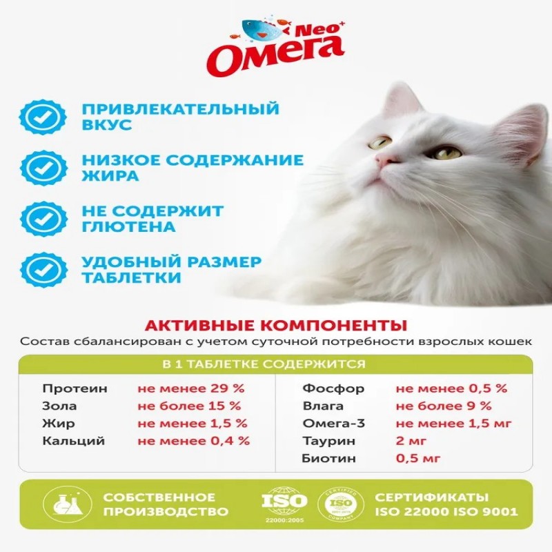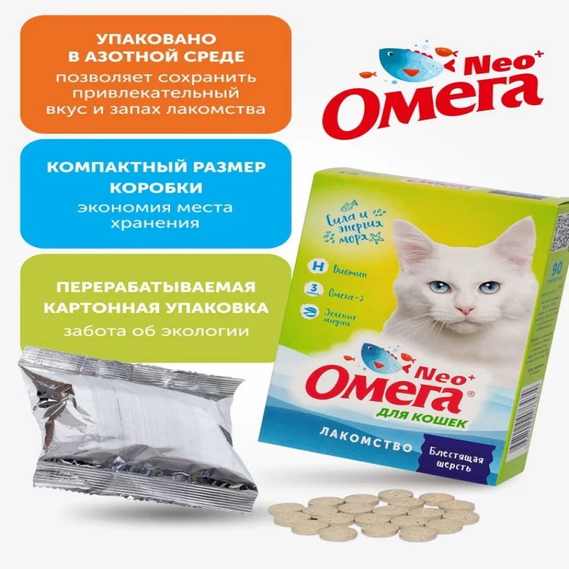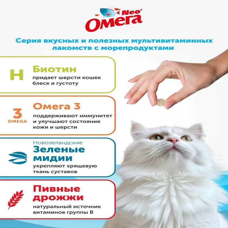 Омега Neo+ — вкусное и полезное лакомство для поощрения, баловства и поддержания естественной красоты шерсти кошек.