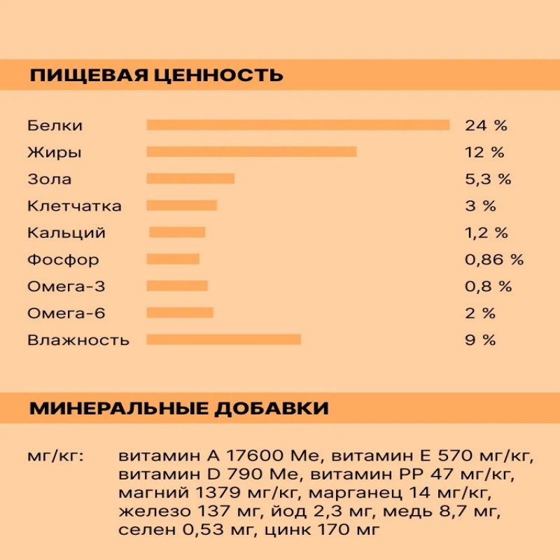 Пищевая ценность: белки 24 %, жиры 12 %, зола 5,3%, омега-3 мин. 0,8%, омега-6 мин. 2%, кальций макс. 1,2%, фосфор макс. 0,86%, клетчатка макс. 3%, влажность 9%.
