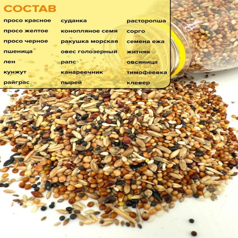 просо красное, просо желтое, просо черное; пшеница; лен; кунжут; суданка; коноп. семя; сорго; овес голозерный; рапс; канареечник; расторопша; ракушка морская; семена ежа; житняк; овсяница; тимофеевка; пырей; райграс; клевер.