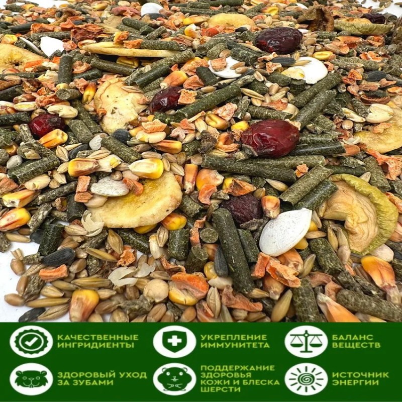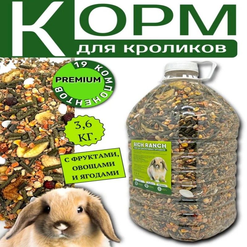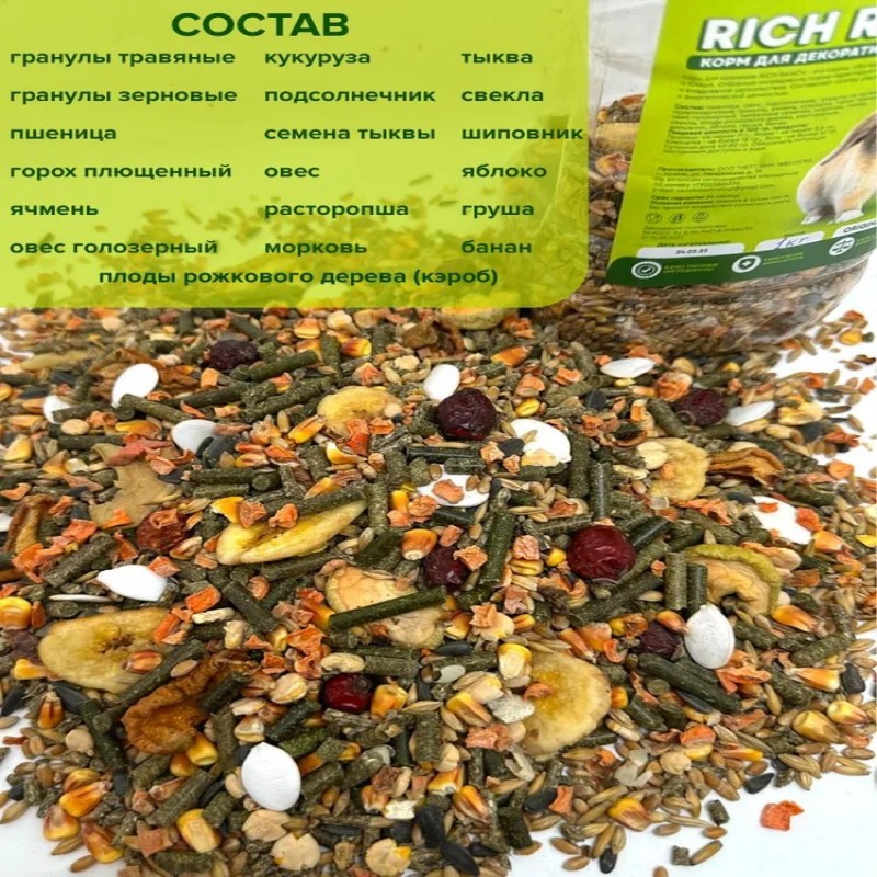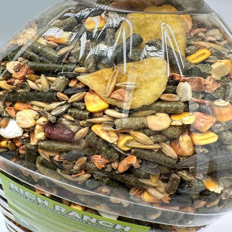 Питание вашего питомца - наша забота! Представляем вам сухой корм бренда RICH RANCH - идеальное решение для кроликов. Он обеспечивает полноценное и сбалансированное питание, удовлетворяющее все потребности вашего любимца. Зерновая смесь, основа нашего корма, содержит все необходимые витамины, минералы и питательные вещества, чтобы поддерживать здоровье и энергию вашего питомца. Вкусняшки и лакомства добавляются в нашу зерносмесь, чтобы сделать ее еще более привлекательной для вашего питомца. Каждый кусочек корма RICH RANCH станет для вашего грызуна настоящим угощением! Выбирая наш сухой корм, вы выбираете качество и надежность. RICH RANCH - это проверенный временем бренд, который уже долгие годы радует владельцев грызунов своим высоким качеством и вкусом. Доверьтесь нашему опыту и заботе - вашему грызуну будет вкусно, полезно и интересно каждый день! Попробуйте наш корм для кроликов и других грызунов прямо сейчас и убедитесь сами! Данный корм так же отлично подойдет для всех видов грызунов, включая крыс, мышей, шиншилл, дегу, песчанок, морских свинок, хомяков и джунгариков.