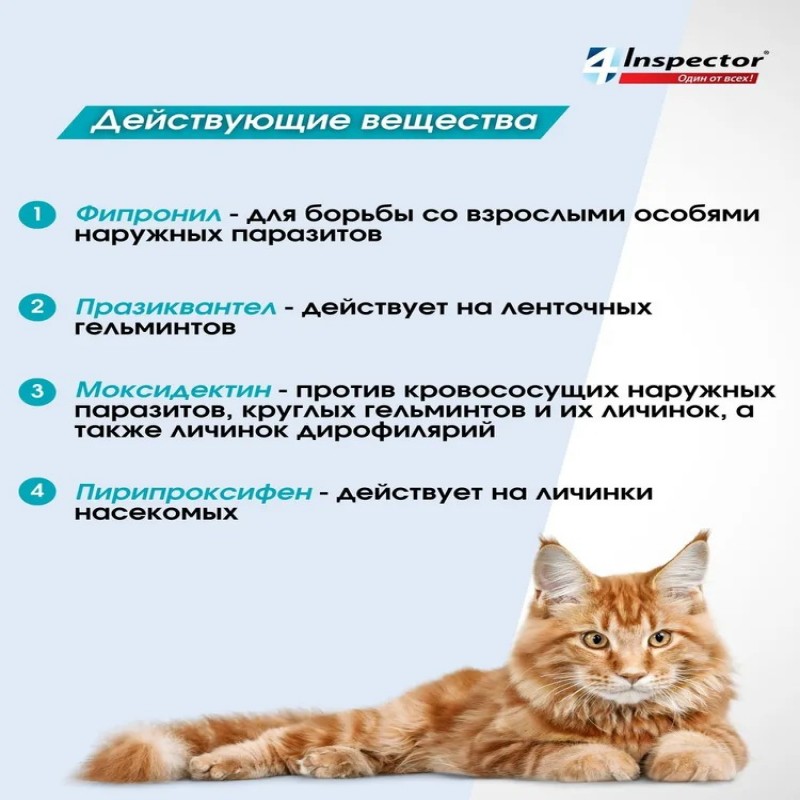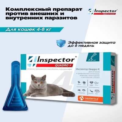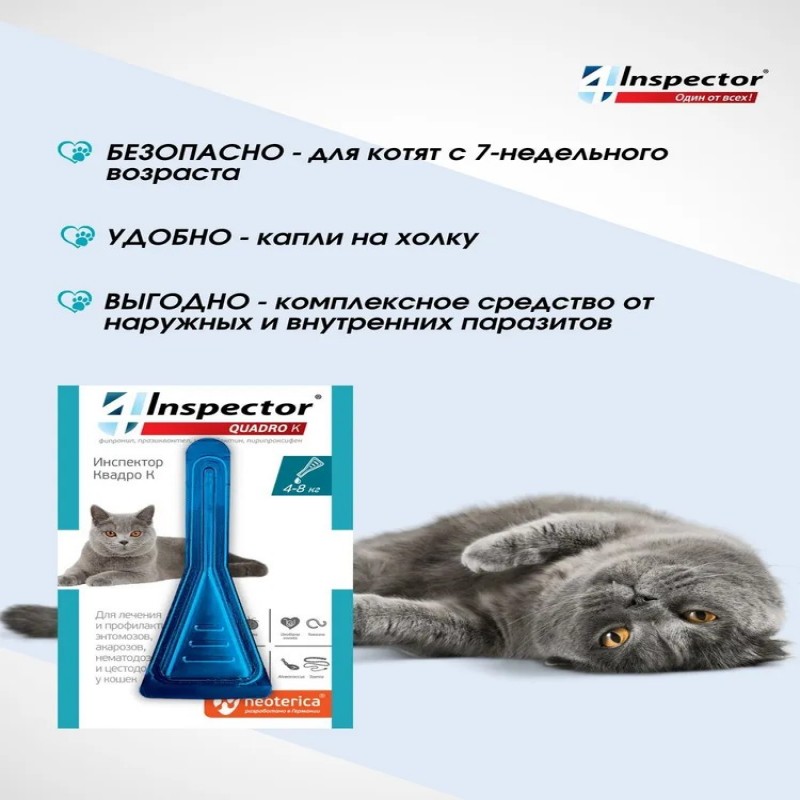 Способ применения: Нанесите Inspector на кожу в области холки (между лопатками), максимально раздвигая шерсть. Не втирайте. Не рекомендовано мыть животное 2 дня до и 4 дня после обработки.